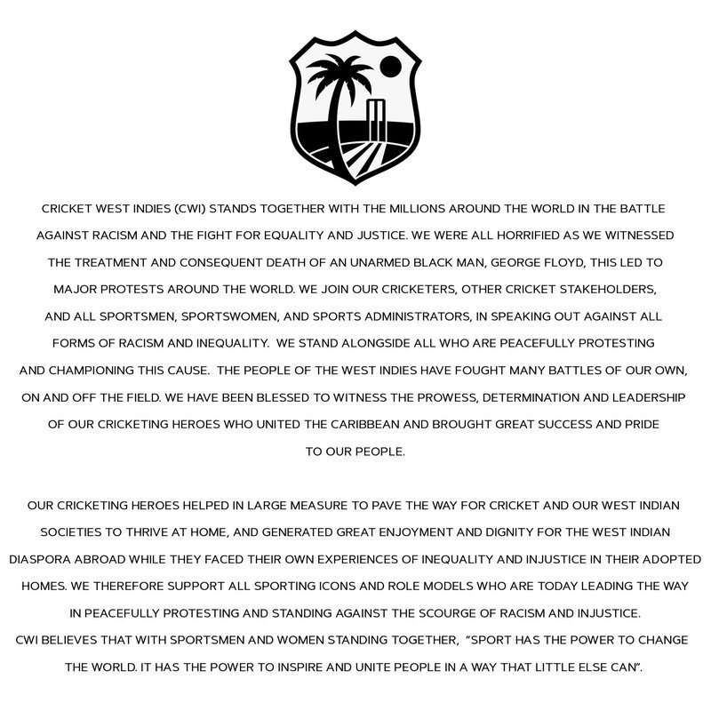 Cricket West Indies (CWI) stands together with the millions around the world in the battle against racism and the fight for equality and justice. We were all horrified as we witnessed the treatment and consequent death of an unarmed black man, George Floyd, and the protests which have followed.